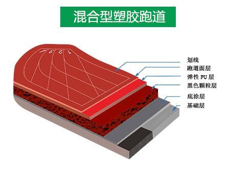 混合型聚氨酯跑道以化學(xué)原料在工廠制備甲乙兩組分, 現(xiàn)場使用時,將兩組分混合,同時加入填料等,經(jīng)過鋪設(shè)、噴涂顆料等一系列工序而成。具有彈性好、防滑、耐磨等優(yōu)點(diǎn),且面層不容易脫粒。廣泛使用于國際、國內(nèi)大中型田徑場。